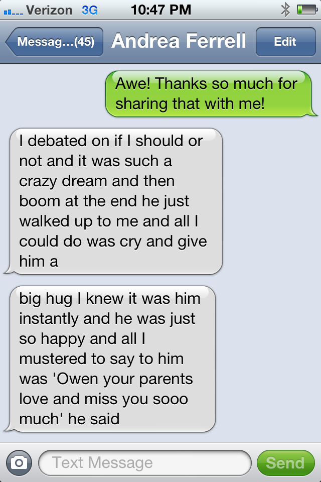 Wow. I was smiling but tears were falling by the bucket full. And isn't it awesome that God counts every single tear we cry - he loves us that much - just had to throw that in there too. So, I thanked her for sharing that with me and then as if realizing it was all okay with me and not too upsetting she went back and elaborated on it all. She said in her dream he walked up to her and she knew it was him and she started crying, she hugged him and told him "your parents love you and miss you so much" to which he responded, "I know but I have a present for them" then he smiled and ran off. I know it was just a dream but for me it was a reminder that he's safe and happy and it was a reminder that God has wonderful things in store for us. More than anything else it was a message of hope and God's faithfulness - for me.